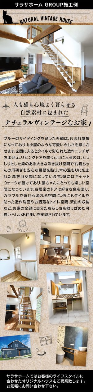ブルーのサイディングが映える山小屋風住宅。吹き抜けリビングや梁、キャットウォークなど猫と暮らす工夫が満載。造作洗面や収納も充実したデザイン性の高い注文住宅です。