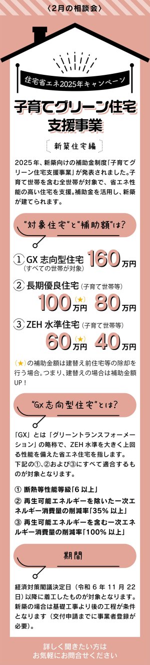 2025年、新築向けの補助金制度「子育てグリーン住宅支援事業」が発表されました。子育て世帯を含む全世帯が対象で、省エネ性能の高い住宅を支援。補助金を活用し、新築が建てられます。