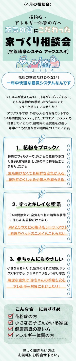 アックスネオの24時間換気システムで、花粉をブロックしながら快適な空気環境を実現。エコエアーシステムが温度差を抑え、一年中心地よい室内をキープ。花粉症対策にも効果的な高性能換気システムです。