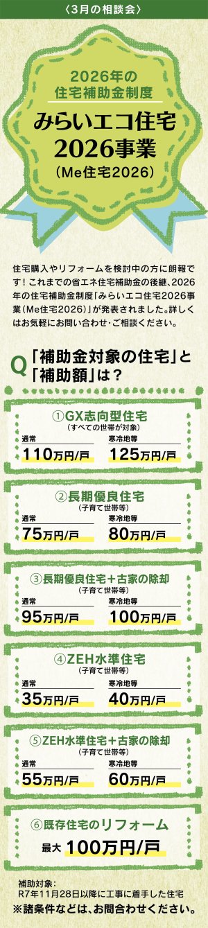 住宅購入やリフォームを検討中の方必見。省エネ住宅補助金の後継となる「みらいエコ住宅2026事業(Me住宅2026)」が発表されました。2026年の補助金制度について、詳しくはお気軽にご相談ください。
