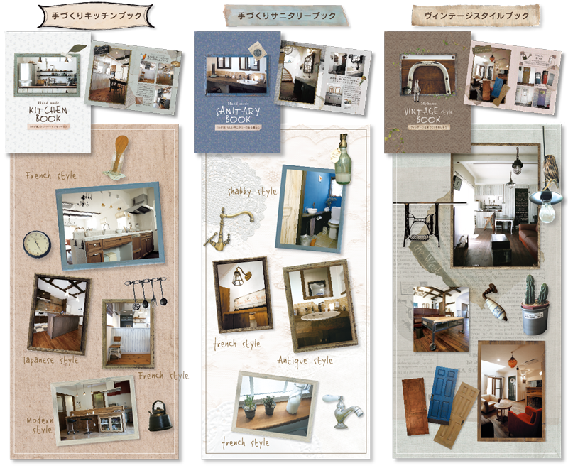 可愛いタイルのキッチンや美しい和モダンキッチンなど、 満載の「手づくりキッチンミニブック」と、 わが家だけのアイデアサニタリーを掲載した 「手づくりサニタリーミニブック」そして、 味わいを楽しむヴィンテージスタイルを特集した 「ヴィンテージスタイルブック」を差し上げます。 ご希望の冊子をお選び頂き、下記フォームよりご応募下さい。