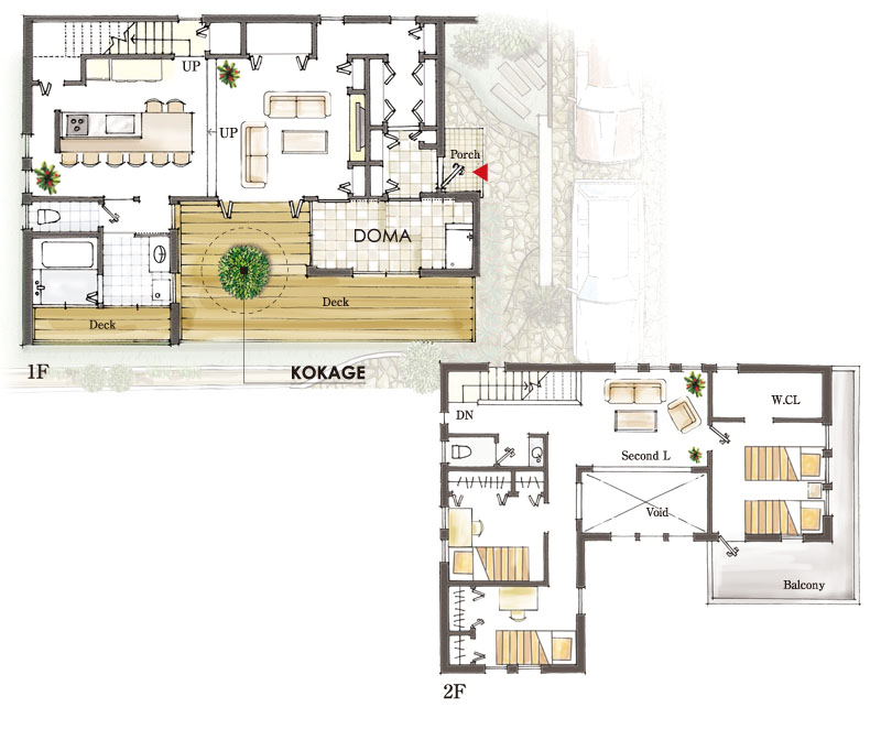 キッチンからリビング、そしてフルオープンのサッシを開けばデッキまでもがひと続き。 そんな開放的な暮らしの中にも、それぞれのシーンごとを柔らかに分けるスキップフロアーを取り入れ、 落ち着きある空間としての快適性を持たせています。